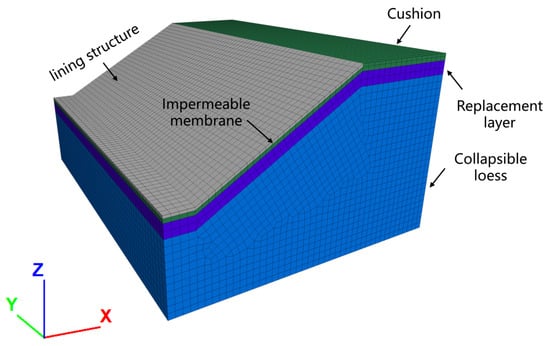 In the numerical model, it is first necessary to divide the canal model into a series of meshes and then to calculate the stresses and strains of each point. According to the Mohr-Coulomb model, the elastic modulus and yield strength of the material can be calculated from the relationship between stress and strain [47]. When the stress exceeds the yield strength of the material, the strength reduction method is used to adjust the strength according to the damage state of the material. This is achieved with a reduction factor, which is typically based on the damage criteria and the intrinsic parameters of the material. The stability analysis of the canal slope involves complex mechanical calculations and numerical simulations, so the constitutive relationship of the loess at the base of the canal still needs to be further refined. In addition, when the stability of the channel slope is lower than the limit equilibrium state, the numerical calculation will not converge. The results of the Fs and displacements in the study are only used as the criterion of the soil stability condition, but not for the quantification of the actual sliding displacements in the project.