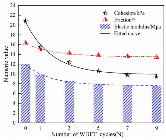 Figure 4 shows the change curves of the c, φ, and E of loess specimens with varying WD-FT cycles. As can be seen from Figure 4, the c, φ, and E all exhibit a decreasing trend with the increasing WD-FT cycles, with the decay amplitude of the c being the largest and that of the φ being relatively lower. By fitting the data in Figure 4, it is concluded that the exponential function can well describe the influence of the number of WD-FT cycles N on the c, φ, and E of loess. The fitted equations are as follows: