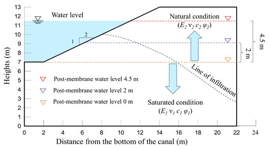 In summary, the influence of the seepage overflow point height on the change in the water level behind the impermeable membrane on the canal slope is relatively small, while the water level in the operation period of the canal significantly affects the water level behind the impermeable membrane. The water level behind the impermeable membrane rises with the increase in the water level in the operation period of the canal. The influence of the seepage overflow point height on the stability of the canal slope is ignored in the following finite element analysis, and only the influence of the change in water level in the operation period is considered. To simplify the calculation, the water level behind the impermeable membrane is set up to be 2 m above the base of the canal, as shown in Figure 7.