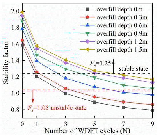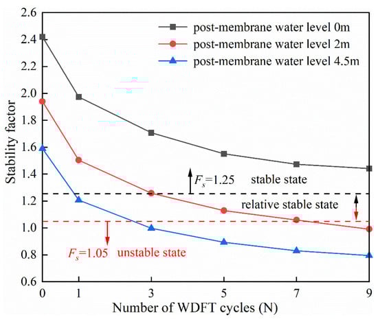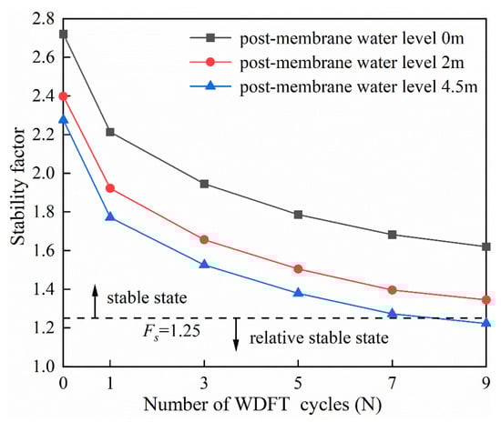 As can be seen from Figure 8 and Figure 9, the Fs of the canal slope decreases with the increase in the number of WD-FT cycles, and the magnitude of the first decrease is larger. The stability factor Fs of the canal slope decreases with the increase in the water level behind the impermeable membrane. The canal slope with a water level of 4.5 m behind the impermeable membrane can remain stable after nine WD-FT cycles.