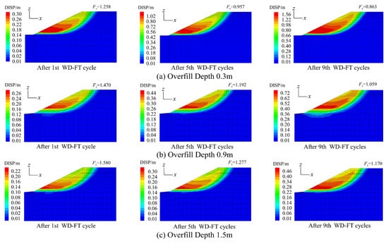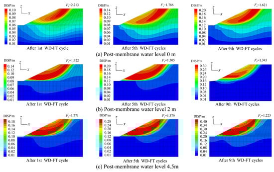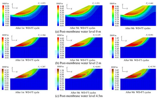 Based on the numerical simulation results, the relationship between the Fs of the canal slope and the number of WD-FT cycles under the different water levels behind the impermeable membrane is plotted in Figure 8. The variations in the stability of the canal slope under the combined action of the WD-FT cycles, canal seepage, and hydrostatic pressure during the water conveyance period are investigated. Meanwhile, to visually obtain the location of the potential slip surface and the displacement when the sliding damage of the canal slope occurs, the displacement programs under different WD-FT cycles are selected for comparative analysis, as shown in Figure 9.