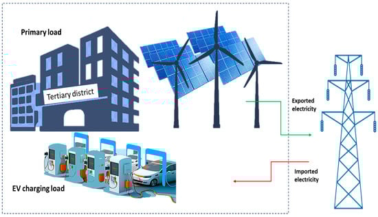 This work simulates different energy system configurations integrated with EV charging stations to electrify a tertiary sector in Egypt. The energy systems were designed and simulated using HOMER Grid 1.11 software, a powerful tool for designing and analyzing microgrid systems that include electric vehicle (EV) charging stations [24,25]. HOMER Grid is more suitable for examining the optimal design of renewable energy distribution systems connected to the grid and integrated with EV charging stations. It is also more suitable for technical and economic evaluations, as well as conducting sensitivity studies for such systems. The proposed system is a centralized distributed hybrid renewable energy system located in an area close to the loads of the five hotels, as these hotels are located close to each other. The architecture of the proposed system can be observed in Figure 1. The diagram illustrates that the solar panel array and wind turbine generate electricity to power the hotel buildings (tertiary district) and electric vehicle charging stations. Excess electricity can be exported back to the utility grid under a power purchase agreement (PPA) of 0.02 USD/kWh, while the building can also import electricity from the grid when needed under the feed-in tariff scheme of 0.07 USD/kWh. The steps involved in modeling and simulation using HOMER Grid software can be explained as follows: The user starts by defining the load profiles for both the primary load and EV charging stations, then defines the renewable energy sources. Subsequently, the user selects the appropriate components of the system, taking into account the technical and financial data, and establishes system constraints. The software then performs simulations to evaluate system performance and calculate costs related to different configurations of components. The simulation results can be employed to refine the design of the microgrid system and make well-informed decisions regarding the selection of components.