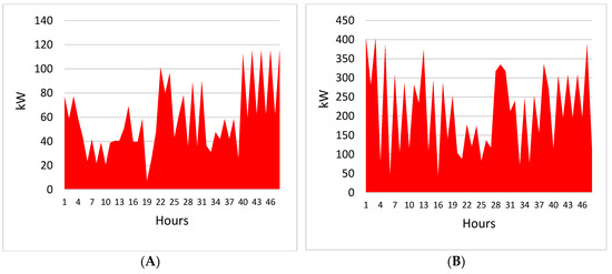 Seasonal (winter (A) and summer (B)) daily electric load curves in kW for the primary electricity load.