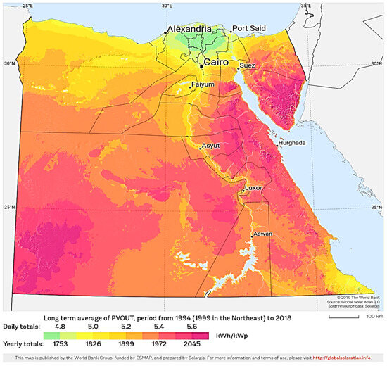 - Global Solar Atlas. Available online: https://globalsolaratlas.info/download/egypt (accessed on 13 December 2023).