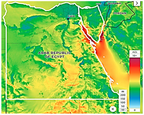 Map of wind speed at 10 m above surface level in Egypt [27]. The map is sourced from Global Wind Atlas (https://globalwindatlas.info/en/area/Egypt) accessed on 22 May 2024.