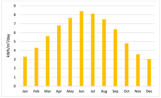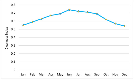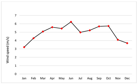 Egypt boasts an excellent photovoltaic daily power potential ranging from 5.0 to more than 5.6 kWh/kWp (Figure 3). The wind atlas of Egypt indicates that the country enjoys high wind energy potential, with wind speeds ranging approximately between 3.5 and 9.0 m/s in some areas (Figure 4). The tourism district considered in this study is located in a very promising area for exploiting PV and wind power systems, with a latitude of 25°27′ N and a longitude of 30°34′ E in Fayoum, Egypt. Solar irradiation and wind speed measurements for one year at 15 m above the surface of the Earth for the location of the selected load were sourced from the measurement station installed at Fayoum town. Figure 5 shows the average monthly global horizontal sun irradiance at the power plant’s location, consistently exceeding 5.0 kWh/m2/day in almost all months of the year. Figure 6 shows that the atmospheric clearness index of Fayoum town has a value greater than 50% in all months of the year. The average monthly wind speed ranges between 3.21 m/s and 5.9 m/s at a 15 m hub height (Figure 7).