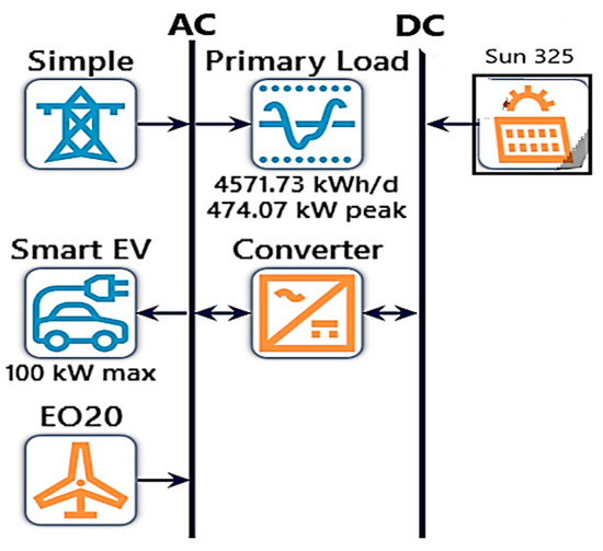 The paper considers grid-connected hybrid renewable energy systems (HRESs) comprising PV panels and wind turbines (WTs). Figure 8 illustrates the layout of the suggested hybrid model integrated with the primary load and EV charging station. The technical and economic data of the system components are described in detail in Table 2 and are based on types available in the local market with high efficiency and reasonable prices [9].