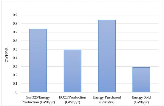 This paper proposes a centralized distributed grid-connected HRES to power a group of five hotels located in the same area. The total electrical load is estimated at 1.7 GWh/yr. The system boundary condition is set to a 1.0 MW PV system and five wind turbines based on the available space for establishing the HRES. The simulation results show that the optimal HRES comprises 420 kW of PV and five wind turbines with a specified rating of 20 kW, both integrated with the utility grid. Table 3 presents the performance results of the PV and wind turbines. It can be observed from this table that the PV system operates for 4384 h per year, indicating approximately 12 h of sunshine per day. The results also show that the wind turbines operate for 7762 h per year, highlighting the attractiveness of this region for solar and wind energy applications. The comprehensive performance data for the optimal system configurations are presented in Figure 9. The optimal HRES is capable of generating 1.2 GWh/yr of electric energy through PV and wind turbines, achieving a total renewable energy fraction of 58%. The amount of energy purchased is estimated to be 844 MWh/yr, accounting for 42% of the required electric energy. The amount of energy sold is estimated to be 291 MWh/yr.