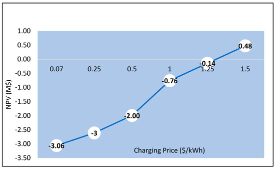 The charging price of electric vehicles has significant implications for revenue generation and the economic viability of EV-related investments. Balancing affordability for consumers with the need for sustainable revenue streams is crucial for the long-term success of EV adoption and charging infrastructure deployment. However, as Egypt is still in the early stages of EV adoption, the EV charging price has not yet been determined. Therefore, it is crucial to study the sensitivity of the EV charging price to the total net present value (NPV) of the project. In this study, a sensitivity analysis of the charging price of electric vehicles (EVs) on the NPV is conducted to assess the impact of varying charging prices on the financial viability of the project. By examining the influence of charging prices on NPV, stakeholders can make more informed decisions about the economic feasibility and sustainability of the EV charging project. Figure 10 illustrates the results of the sensitivity analysis of the charging price against the NPV. In this study, we examine the change in charging price for prices equal to and greater than the electricity price in Egypt. The range of charging prices is from USD 0.07 to USD 1.5 per kWh. The results indicate that increasing charging prices leads to an increase in project profitability. After the charging price reaches USD 1.5 per kWh, the NPV becomes a positive value. This suggests that the charging price has a significant impact on the economic feasibility of the project.