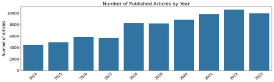 Our analysis employed a two-layered approach, enhanced by Python scripting for precision and efficiency. Initially, we categorized articles based on keywords like ‘power distribution grid’ and ‘distribution network’, supplemented with domain-specific terms: ‘planning’, ‘operation’, and ‘market’. To ensure the integrity and uniqueness of our dataset, we rigorously removed duplicate papers that appeared across categories. Following the keyword analysis, we examined the temporal distribution of these articles to capture the evolving focus on digitalization over the past decade. This investigation highlights an increasing trend for research publications on this subject, indicative of the escalating integration and significance of digital technologies in this field. Figure 1 illustrates the annual number of publications in this area from 2014 through to 2023, revealing that research interest has more than doubled over the past decade.