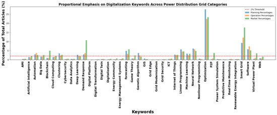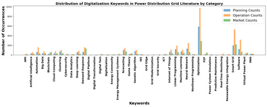 In the secondary analysis phase, we assessed the multidisciplinary nature of the articles by calculating the percentage within each category that contained more than one specified digitalization-related keyword. This analysis revealed significant thematic overlap: 38.35% in planning, 35.47% in operation, and 46.10% in market. These percentages highlight a strong trend for integrating multiple digital technologies within power distribution grid research, underscoring the complexity and interconnectedness of this field.