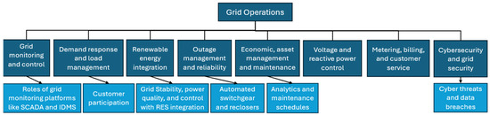 The planning section examines digitalization’s impact on power grid planning, emphasizing the integration of AI, IoT, and big data analytics. It highlights how these technologies transform traditional planning, focusing on enhanced load forecasting accuracy, optimized network design, and improved reliability and efficiency. Figure 4 illustrates the planning section’s structure and its interconnected themes and main points.