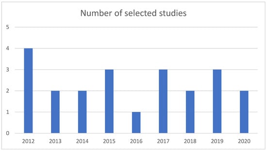 In order to organize the analysis of the 22 selected primary studies and differentiate them from the rest of the references in this document, we assigned them an identifier, as seen in Table 2. Concerning the years of publication of the selected studies, a variable frequency can be observed regarding the number of publications, highlighting the years 2012, 2015 2017, and 2019, as seen in Figure 2. In the most recent years, the number of studies proposing software architectures for developing adaptive mobile learning systems has decreased.