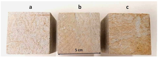The Hořice sandstone, quarried in the Czech Republic, was chosen due to its high porosity (resulting in both fast water infiltration and high hydraulic conductivity), as well as due to its mechanical stability in water. This sandstone was widely used for constructions in the Czechoslovak Republic in the 20th century, as well as for reconstruction works after the Second World War. It was the most widespread decorative stone in Slovakia [21], used on public representative buildings, bank buildings, hospitals, statues, and monuments (Figure 1). Many of these buildings are already in need of restoration. The Hořice sandstone is a fine-grained sandstone, variable in color, mostly light beige to yellowish brown, with irregular rusty streaks of limonite pigment. Quartz is the dominant mineral (>90%); other minerals such as glauconite, feldspars, mica, or heavy minerals are minor. The sandstone contains intergranular cement, which is a mixture of kaolinite, illite, and fine quartz grains [22]. The basic physical properties of sandstone are as follows: bulk density ρd = 1930 kg·m−3, total porosity n = 26%, open porosity no = 18.3%, water absorption NWAI = 9.5–12.2%, and uniaxial compressive strength UCS = 29.9 MPa [20]. The rock material for the research was taken directly from the Podhorní Újezd quarry in the Podkrkonoší area, which is currently the largest sandstone quarry in the Czech Republic. Test cubes with an edge length of 50 mm were sawn from the sandstone blocks taken from the quarry.