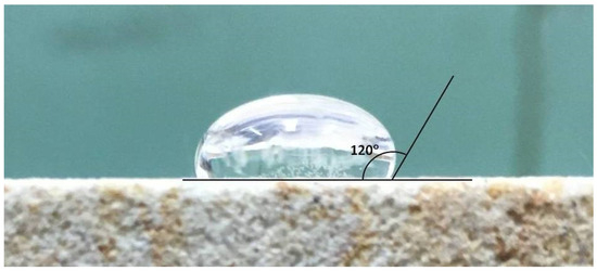 The waterproofing effect of the coating could be seen already by dropping water onto the coated sandstone surface. A magnified photograph of the water droplet (Figure 3) revealed a water/sandstone contact angle of ca. 120°, which proves the surface is hydrophobic [16].