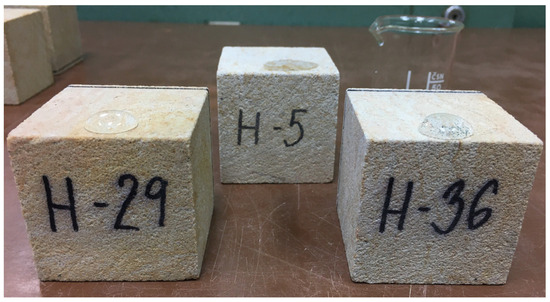 Applied coatings did not create any crust on the stone surface. The Funcosil SNL coating did not even change the appearance of the stone and preserved its original color. The Antipluviol S slightly changed the color of the stone after applying two layers; the rusty smearing of the sandstone was highlighted (Figure 2). According to Munsell Color Charts [27], the color of the sandstone changed from very light brown (10YR8/2) to yellow (10YR8/6).