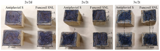 The impregnation depth of the tested coatings on the sandstone is visible in Figure 6. The blue indigo color intensity was used to visually distinguish three zones: 1—hydrophobic zone (original color of the stone), 2—partly hydrophobic zone (light blue color), 3—not impregnated (i.e., hydrophilic) zone (dark blue color). Because of the smooth transition of the color, border lines were drawn very subjectively and the penetration depth cannot be exactly quantified. The penetration depth is irregular even in one sample, probably due to local differences in the grain size and porosity. Thin sections could explain more, but they were not available.