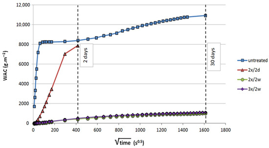 The progress of the WAC tests in time is expressed in Figure 7 where all types of samples are represented: untreated and impregnated ones. Each series of samples is characterized by one representative line (an average of three to four tested samples). Raw data of this plot can be found in Table S1.