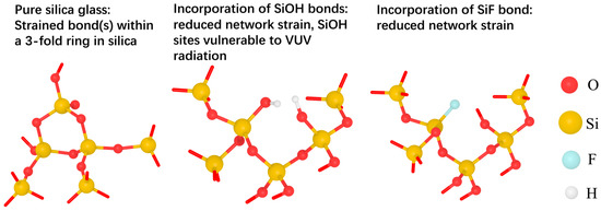 Chemical structure defects in fused silica due to the introduction of OH- and F- ions.