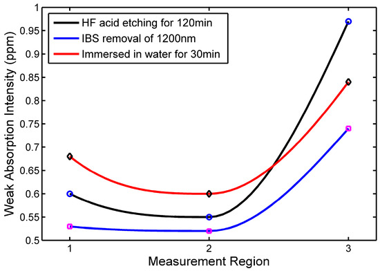 The absorption loss of high-energy optics has become a very important parameter to evaluate their performance. As a non-destructive detection technology, the photothermal weak absorption detection technology can detect the absorption loss accurately, quickly, and in real-time [21]. If there are damaged precursors on the surface, the photothermal absorption peak of the corresponding intensity will appear on the detection chart, and the smaller the photothermal absorption signal obtained, the weaker the absorption loss. In this paper, the photothermal weak absorption detection technology is used to detect and evaluate the absorption characteristics of the IBS surface. The changes in photothermal weak absorption intensity of three marking points on fused silica surfaces before and after immersion were tested, and the size of each area was 3 mm × 3 mm. Figure 3 shows the change curves of photothermal weak absorption intensity corresponding to the three marked areas on the sample surface.