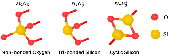 On the other hand, the waviness of microscopic fluctuations on the solid surface is mainly manifested in the form of lattice defects, vacancies, and dislocations at the atomic scale. The chemical state of surface atoms is also different due to the different structural forms of atoms at different surface defect locations. The silicate glass surface composed of [SiO4] mainly contains unsaturated structures such as non-bonded oxygen, tri-bonded silicon, and cyclic silicon, as shown in Figure 5.