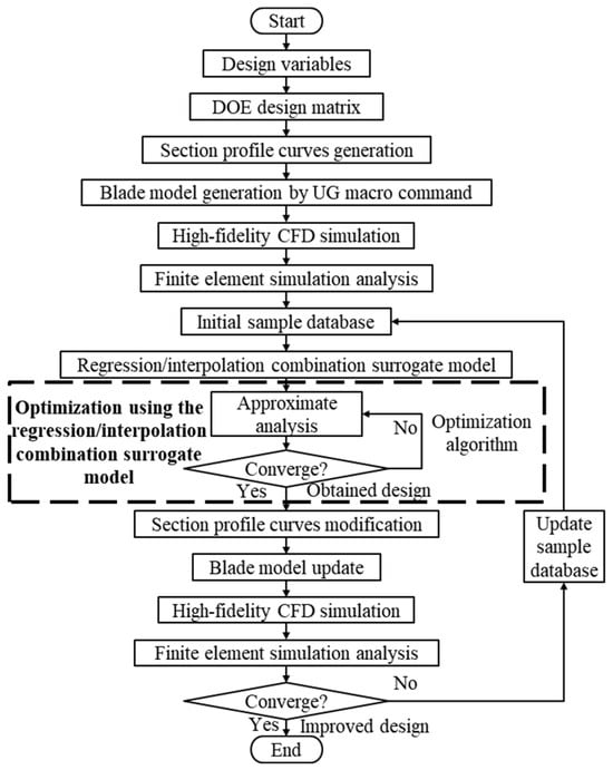 This study focuses on optimizing the turbine blade. To enhance isentropic efficiency within the constraints of aerodynamic and strength performance, an efficient multidisciplinary integrated design optimization method for the cooling turbine blade is proposed. This method combines a parametric modeling approach for the cooling turbine blade with cooperative coupling characteristics, numerical simulation analysis methods from various disciplines, and a regression/interpolation combination surrogate model (Figure 2). The specific steps involved in this method are as follows: