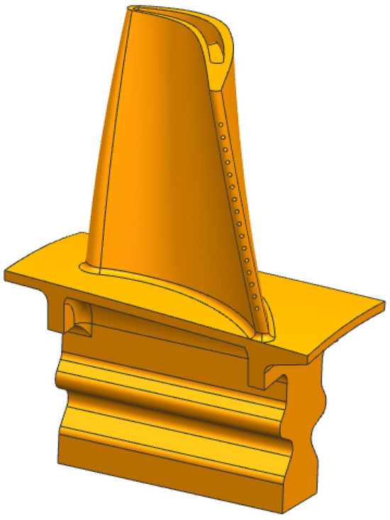 Expanding on the parametric model for the variable wall thickness hollow blade, a feature-based parametric modeling approach was adopted to separately design the leading edge and dovetail structures. Subsequently, typical cooling features, including baffles, turbulence ribs, internal cooling root segments, and trailing edge holes, were iteratively enhanced. Through this iterative process, a comprehensive parametric model for the cooling blade was developed, as illustrated in Figure 6.