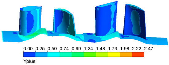 The distribution of dimensionless distance Yplus values near the walls of turbine blades.