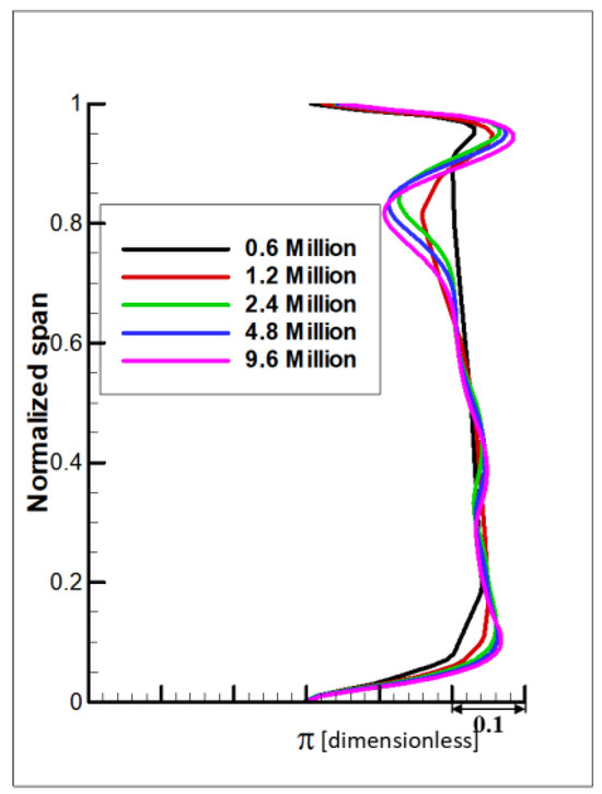 Spanwise distribution of total expansion ratio for turbine blade with different mesh schemes (0.6 million, 1.2 million, 2.4 million, 4.8 million, and 9.6 million).