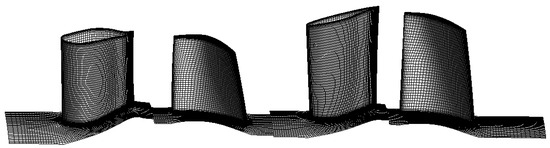 A single blade channel served as the computational domain, with periodic boundary conditions applied on both sides. The flow working fluid in the main channel of this article was gas, with a molar mass of 28.94 kg/kmol. The Dynamic Viscosity was set to 1.831 × 10−5 kg/(m * s). The inlet boundary conditions encompassed total temperature, total pressure, and airflow angle direction. Inlet turbulence was moderated at 5%, while outlet boundary conditions were specified in terms of average static pressure. Solid wall boundaries were treated as adiabatic and no slip wall.