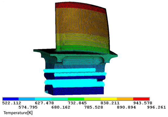 This section analyzes the stress on the first-stage rotor blade with linear elastic finite element analysis by ANSYS. The unit type is 10 nodes tetrahedral unit SOLID187. The temperature field distribution of the cooling turbine blade affects both thermal stress and material mechanical properties, thereby affecting blade strength. The use of a three-dimensional high-fidelity numerical simulation for the flow heat coupling calculation of the blade needs a long cycle, resulting in low efficiency in multidisciplinary design optimization iterations. Therefore, in the optimization analysis of this study, a simplified temperature field was adopted, which is to calculate the average temperature of the blade along the radial section and obtain the distribution of blade temperature along the radial direction. Figure 10 shows the grid and temperature field used in the optimized design.