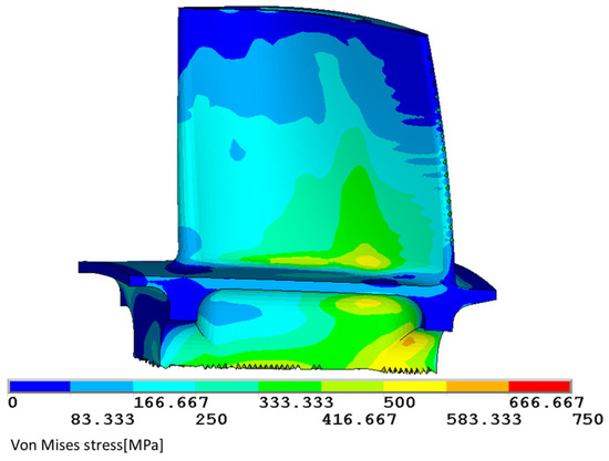 The Von Mises equivalent stress distribution of the first-stage rotor blade.