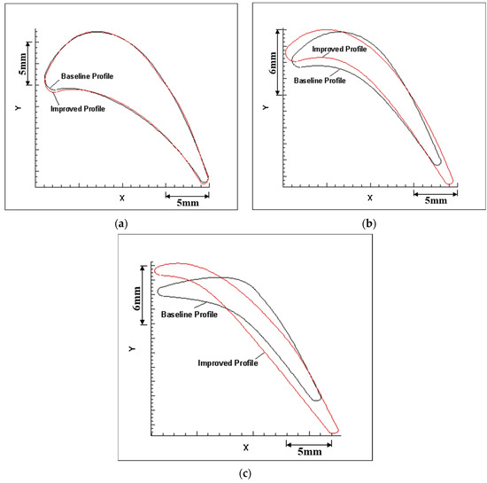 Comparison of the tip, middle, and root profile of the first stage rotor blade before and after optimization. (a) Root section; (b) middle section; (c) tip section.