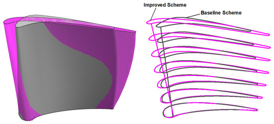 Comparison of the three-dimensional model of the first-stage rotor blade before and after optimization.