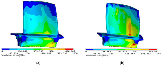 Von Mises stress distribution first stage rotor blade. (a) Initial scheme; (b) optimized scheme.