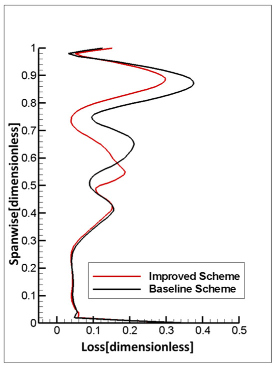 Figure 15 illustrates the spanwise distribution of the energy loss coefficient for the first-stage rotor blade in both the initial and enhanced schemes. Comparing the two plans, it is evident that the enhanced scheme shows minimal changes in losses in areas below 50% blade height, slightly increased losses in areas between 50% and 58% blade height, and notably reduced losses in areas above 58% blade height.