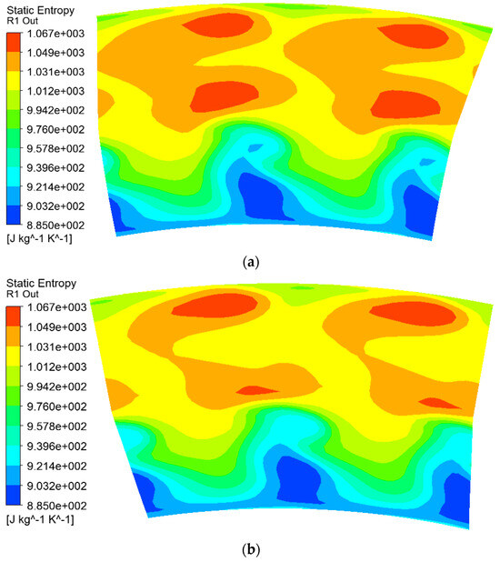 Comparison of entropy distribution at the outlet of the first-stage rotor blade before and after optimization. (a) Initial scheme; (b) optimized scheme.