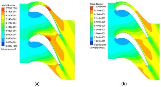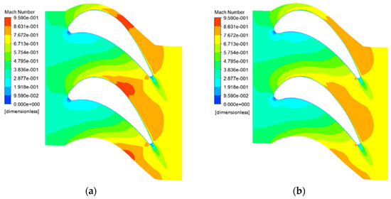 Distribution of the relative Mach number at the 90% span cross section of the turbine blade before and after optimization. (a) Initial scheme; (b) optimized scheme.