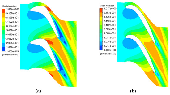 Distribution of the relative Mach number at the 10% span cross section of the turbine blade before and after optimization. (a) Initial scheme; (b) optimized scheme.