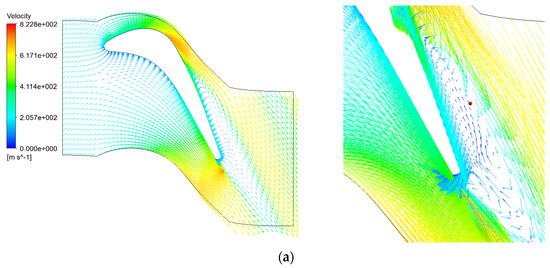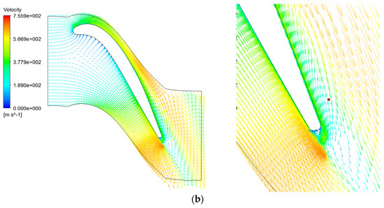 Distribution of the velocity vector at the 90% span cross section of the turbine blade before and after optimization. (a) Initial scheme; (b) optimized scheme.