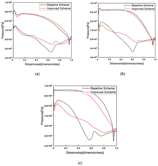 Static pressure distribution of the first-stage rotor blade at different blade height sections before and after optimization. (a) 10% span cross section; (b) 55% span cross section; (c) 90% span cross section.