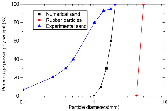 An RSM is a typical binary mixture consisting of rubber particles and sand particles. Figure 2 gives the gradation curves of the numerical sand and rubber particles. The numerical rubber particles have a uniform particle size distribution of 4 mm~5 mm. The rubber particle contents (RCs) are 0%, 10% and 30%. RC is defined as the percentage of the mass of rubber particles to the total mass of the mixture. The numerical model is illustrated in Figure 3. The numerical sample is a cuboid compression chamber composed of six frictionless rigid plates with initial dimensions of 40 mm in length, 40 mm in width and 80 mm in height.