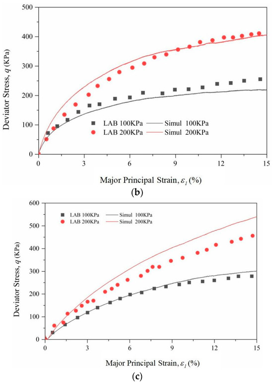 Comparisons of the stress–strain curves between the laboratory experiments and the discrete element simulations: (a) 0%; (b) 10%; and (c) 30%.
