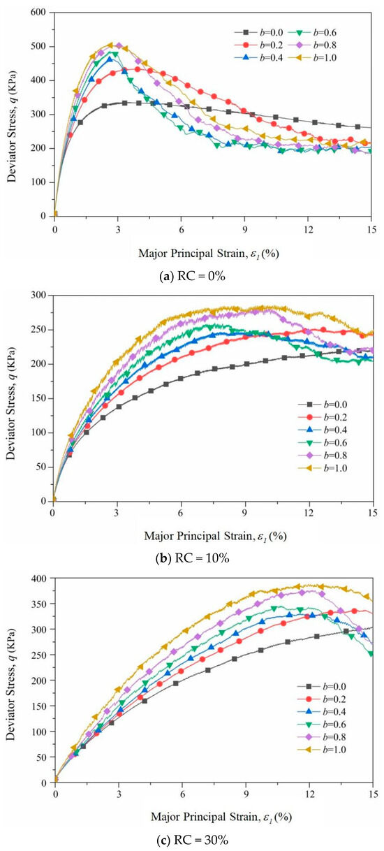 Figure 5 shows the stress–strain relationship curves of samples with different RCs under a confining stress of = 100 kPa. It is demonstrated in Figure 5a that when RC = 0%, as the value of b increases, the curve becomes steeper and steeper and the tangential modulus and peak strength continue to increase. The samples show obvious strain softening during the shearing process, and the softening characteristics are more obvious as b increases. Figure 5b,c illustrate that when RC = 10% and RC = 30%, 0 ≤ b ≤ 0.4, and the sample does not show obvious strain softening; and when 0.6 ≤ b ≤ 1.0 in the test, strain softening appears, but the phenomenon of strain softening is not very significant. With the addition of rubber particles, the increase in b values leads to an increase in the peak deviatoric stress, and the sample gradually transitions from strain hardening to strain softening. This phenomenon may occur because rubber particles are less rigid than sand particles, and the material itself has high compression-rebound characteristics, so the deviator stress gradually increases with an increase in the medium principal stress. The addition of large rubber particles can also cause the samples to initially be dominated by large pores. With the loading and redistribution of small particles, the large pores are filled with sand particles, and the porosity ratio of the sample decreases and the strength increases.