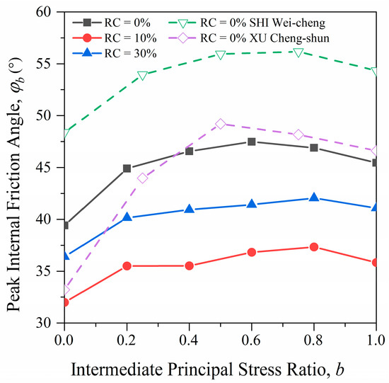 When the influence of intermediate principal stress is not considered, it is the same as the Mohr–Coulomb strength criterion. In order to compare and verify whether the true triaxial numerical model meets the requirements under equal stress path loading, the numerical simulation results when RC = 0% are compared with the indoor experimental results for pure sand of Shi Weicheng et al. [31] and Xu Chengshun et al. [32]. It can be seen from Figure 6 that the peak internal friction angle for the sample increases first and then decreases as the value of b increases. The peak point of the sample appears at b = 0.6. The overall trend is consistent with the results of the indoor experiment, thus verifying the feasibility of the discrete element model of RSM materials under different stress paths. When RC = 10% and RC = 30%, the peak points of the samples all appear at b = 0.8, which is different from the results of pure sand samples.