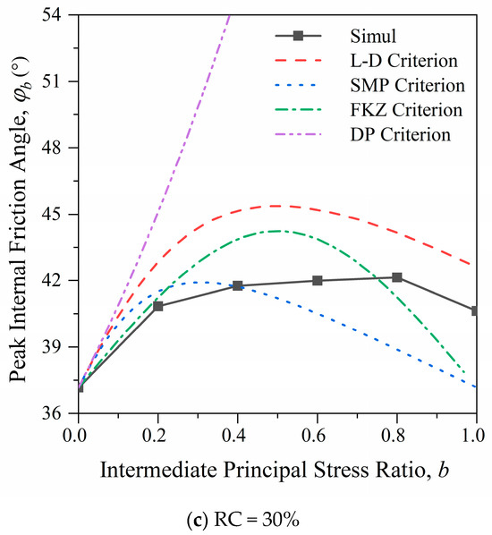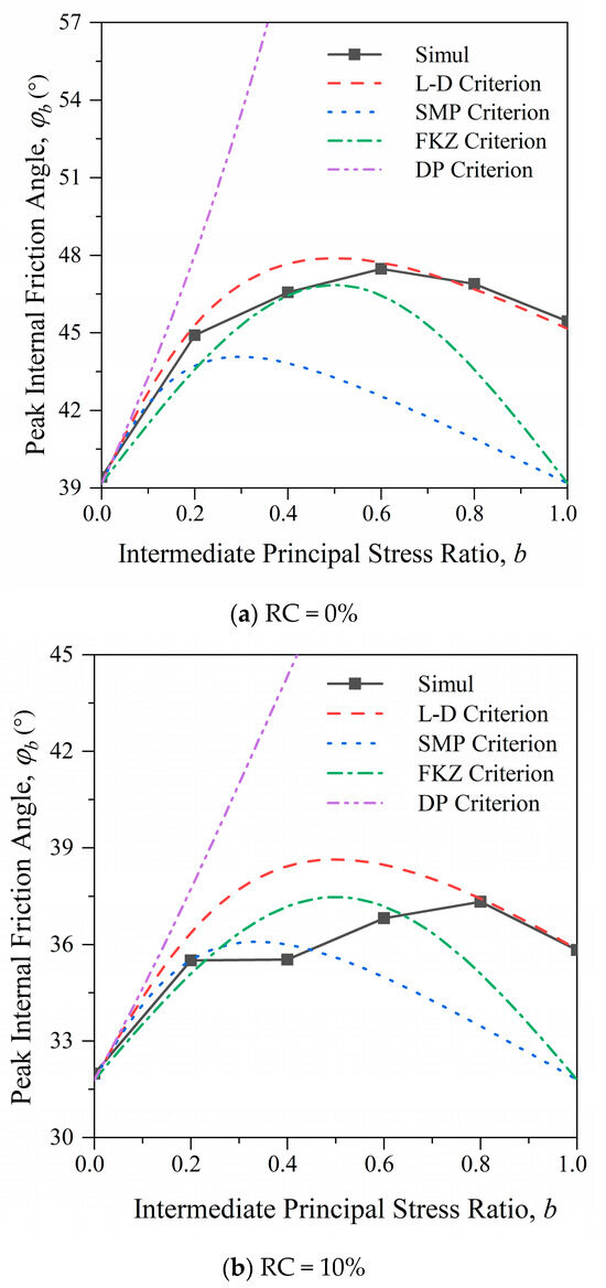 Figure 7 compares the numerical simulation results with these four commonly used failure criteria. As shown in Figure 7a, when RC = 0%, the results of the numerical simulation of the internal friction angle are basically consistent with the predicted results of the modified Lade–Duncan criterion and the SMP criterion, showing a trend of first increasing and then decreasing; at the same time, the FKZ criterion and the DP criterion are clearly not applicable. As shown in Figure 7b,c, for the medium-rubber-content RSM (RC = 10~30%), when 0 ≤ b ≤ 0.4, the simulation result is close to the SMP criterion result, and when 0.8 ≤ b ≤ 1.0, the simulation result is close to the modified Lade–Duncan criterion. When 0.4 < b < 0.8, the peak internal friction angle is larger than the that of the SMP criterion and smaller than that of the modified Lade–Duncan criterion, placing it between the two criteria. In summary, when considering the strength of large-particle rubber and sand mixtures, there is no existing failure criterion that can be fully expressed, and further research is needed.
