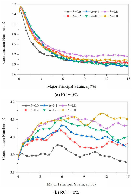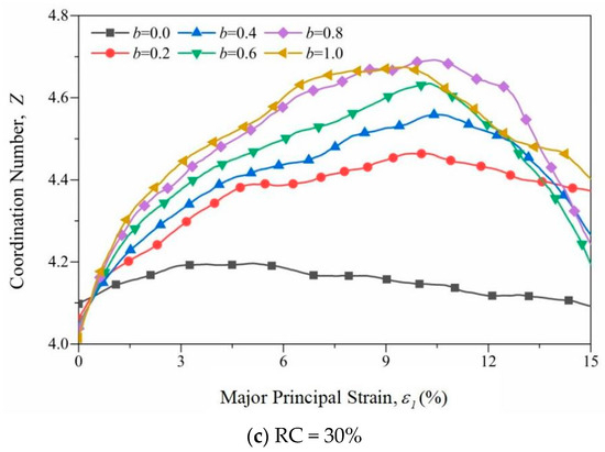 Figure 8 shows the change curve of the overall coordination number in the shearing process of samples with different RCs. Figure 8a shows that the coordination number of pure sand is 5.4 after isotropic consolidation. As the shear progresses, the coordination number gradually decreases to a stable value. For different intermediate principal stresses, as the value of b increases, the sample changes little at the initial stage of loading, and then increases, and its corresponding residual value is similar to the peak deviatoric stress. In Figure 8b,c, due to the addition of large rubber particles, the coordination number of the sample decreases significantly after isotropic consolidation. During the shearing process, it first increases and then decreases. The peak number of digits increases as the middle principal stress coefficient increases. Analyzing the reasons for the above phenomenon, when the RCs in the RSM are different, different pore states will appear in the sample, and with particle compression, climbing and rotation occur in the particle assembly during the shearing process, resulting in a change in pore volume and a coordination number change; the influence mechanism of intermediate principal stress in RSMs involves the large pores inside the sample occupying an absolute advantage. As the loading progresses, the large pores are first filled with smaller particles of smaller pores to make the sample denser. The homogenization process is not greatly affected by the ratio of intermediate principal stress.