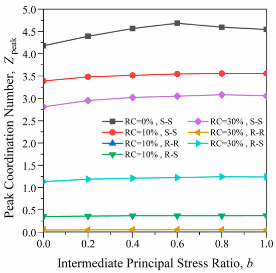 Figure 9 shows the variation curve of peak coordination number with b value for different contact types. As shown in the figure, the peak coordination number is almost unaffected by the intermediate principal stress ratio. As RC increases, decreases, while and gradually increase. When RC = 10%, and are both less than 0.5, and is less than 3.5, indicating that the system is highly unstable.