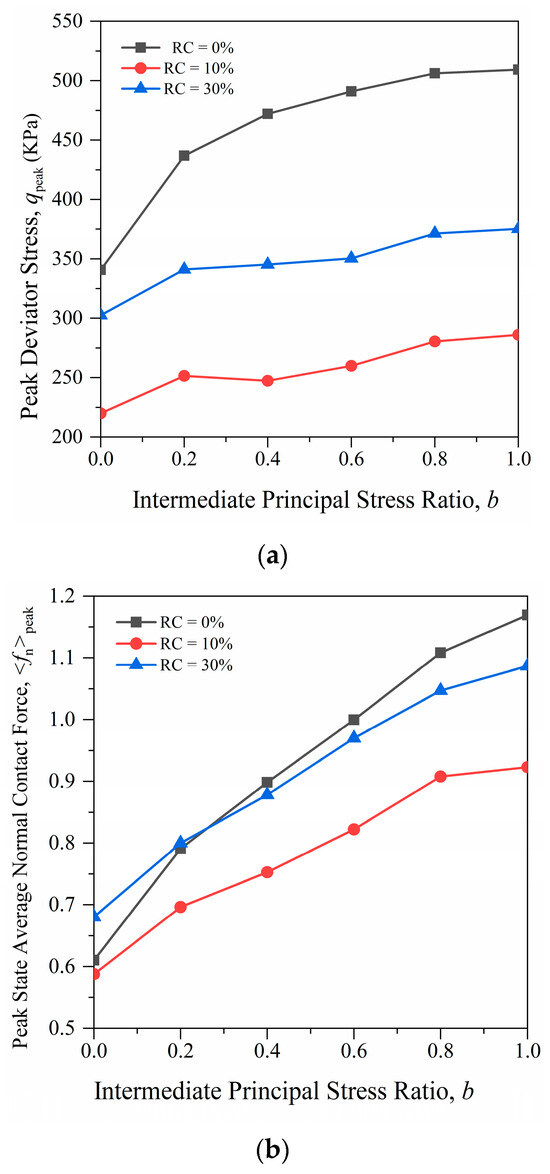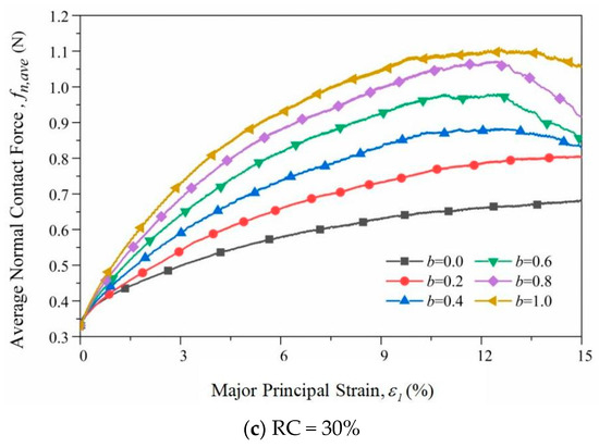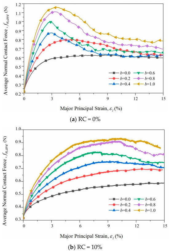 Radjai et al. [37] showed that the average normal contact force between particles plays a major role in the external load. The average normal contact force in the numerical simulation represents the ratio of the sum of the normal contact force of all effective contacts to the number of contacts. Figure 10 shows the average normal contact force vs. the major principal strain of samples with different RCs. It can be seen from the figure that when RC = 0%, the average normal contact force first rapidly increases to the peak value and then gradually decreases to a stable value. As the intermediate principal stress increases, the average normal contact force also increases. With the addition of large rubber particles, when b > 0.4, the average normal contact force will appear similar to the “strain softening” phenomenon, while when b < 0.4, the average normal contact force increases with an increase in the axial strain. Figure 11 shows the curve of the peak deviatoric stress and the average normal contact force with the b values in the peak state. It can be seen that the average normal contact force exhibits a similar law to the peak deviatoric stress.