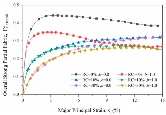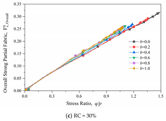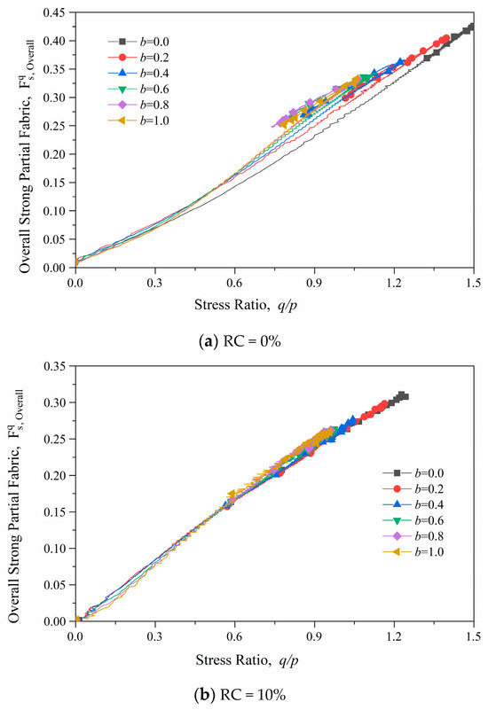 In this formula are the three principal values of the fabric tensor—the major principal fabric; the mediate principal fabric; and the minor principal fabric—and is the partial fabric. Figure 12 shows the evolution of partial fabric of samples with different rubber contents under the loading paths of b = 0.0 and 1.0. The partial fabric increases rapidly and then slowly decreases during the shear process for pure sand samples, while for RSM materials, the partial fabric increases gradually to a stable value. It is also found that the differences between the RSM samples under b = 0.0 and b = 1.0 are much smaller than those of the pure sand samples. This means the pure sand samples have higher anisotropy than the RSM samples. And intermediate principal stress has less influence on the anisotropy of the RSM samples than on the pure sand samples. Figure 13 shows the relationship between the strong partial fabric and the stress ratio of samples with different RCs. It is shown in Figure 13 that the strong partial fabric of the rubber–sand sample has a linear relationship with the stress ratio. The linear relationship between the strong partial fabric and the stress ratio for a mixture of two separate soft and hard RSM materials with stiffness differences of 1000 times remains constant with an increase in RC. This phenomenon shows that despite variations in particle size distribution and particle stiffness, granular materials have an inherent linear relationship between the stress ratio and the partial fabric.